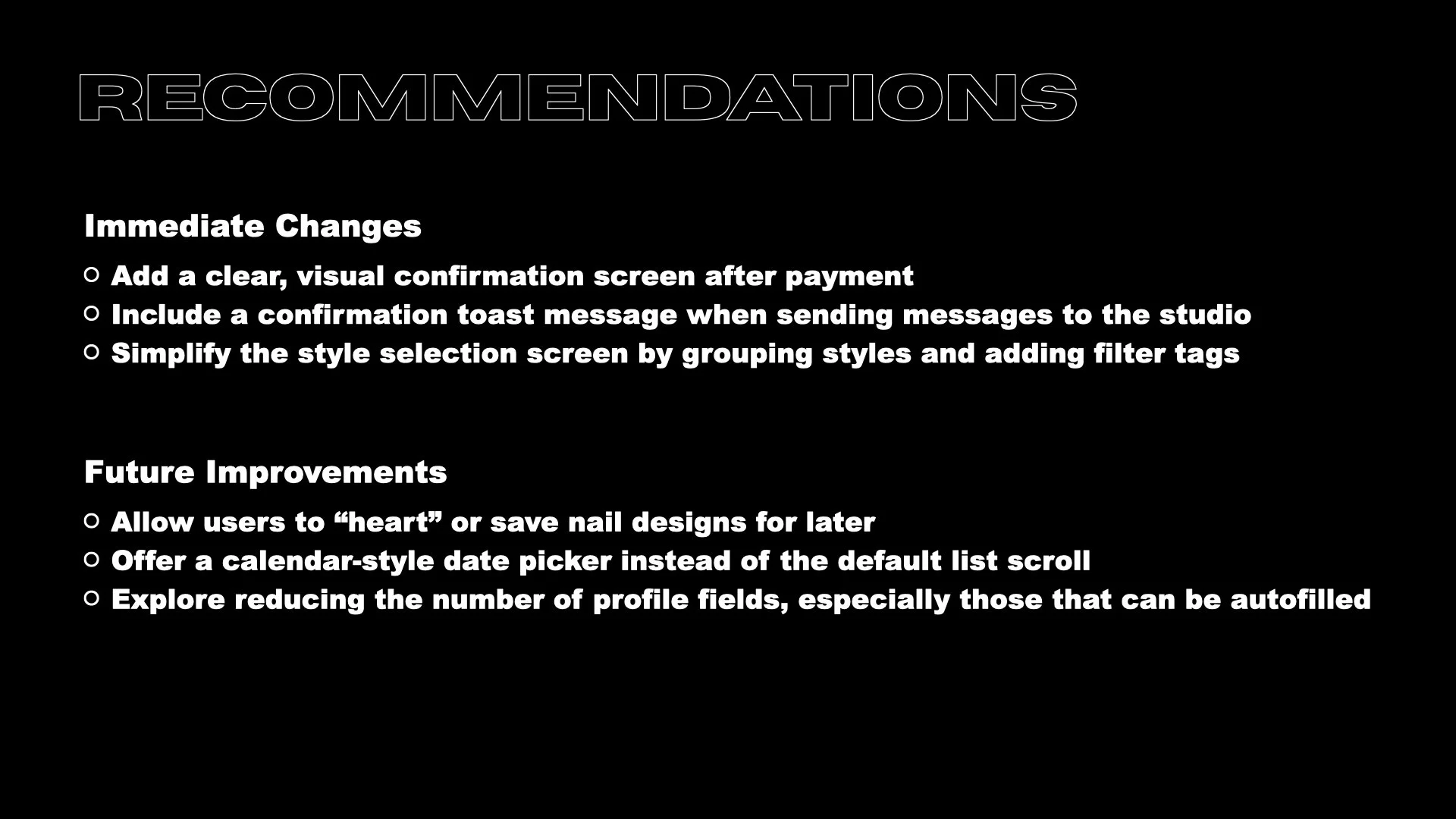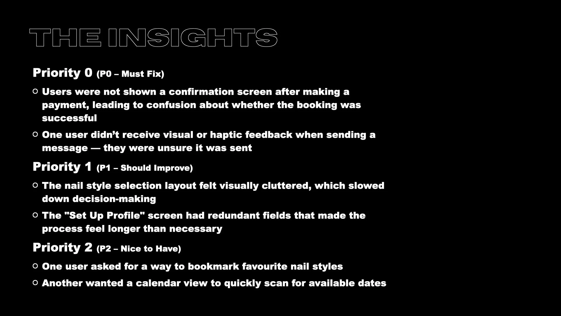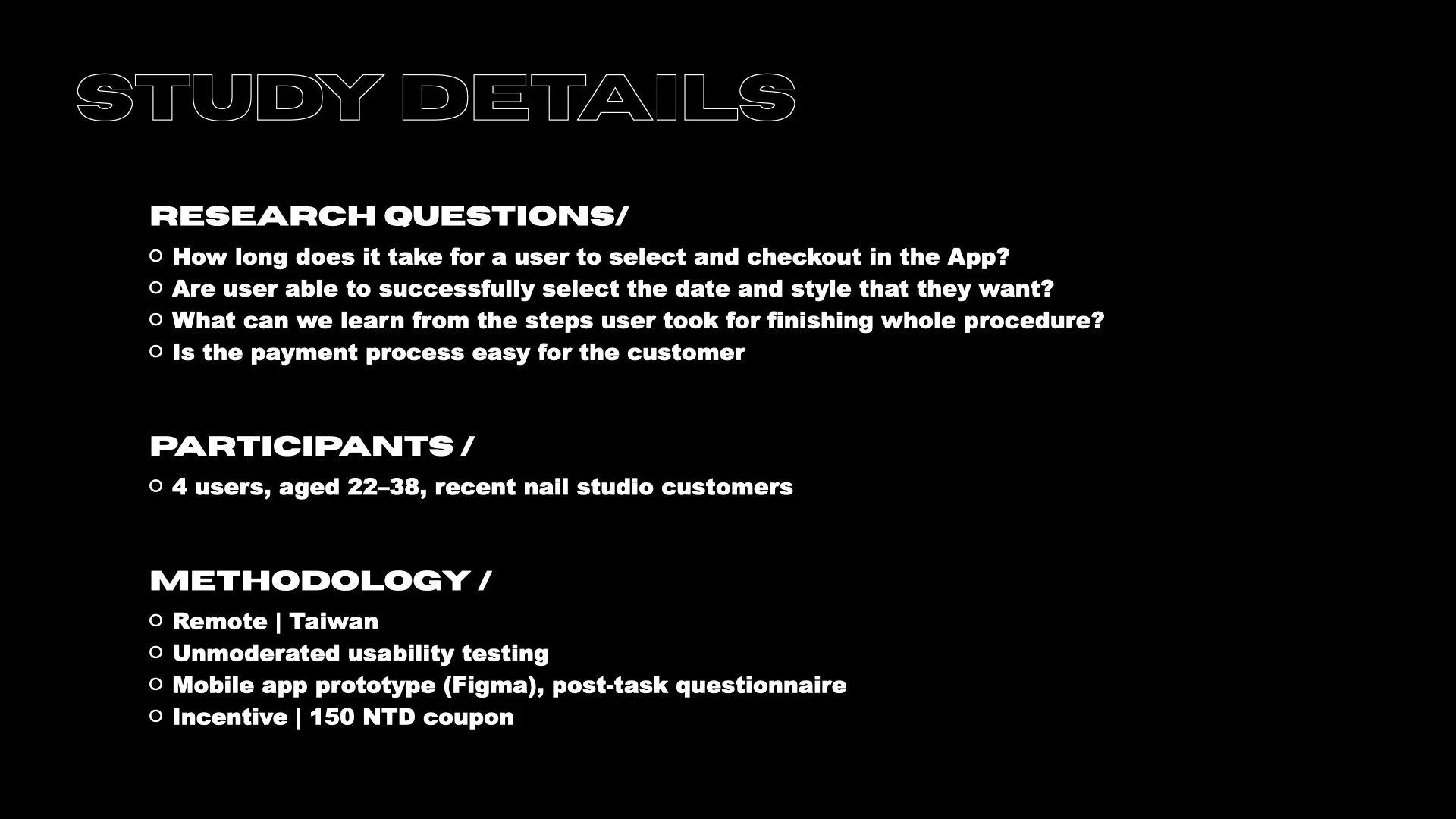 We’d like to figure out what specific difficulties users encounter when they try to complete the core tasks of the Nail Studio’s App as item selection, reservation, and in-App navigation.